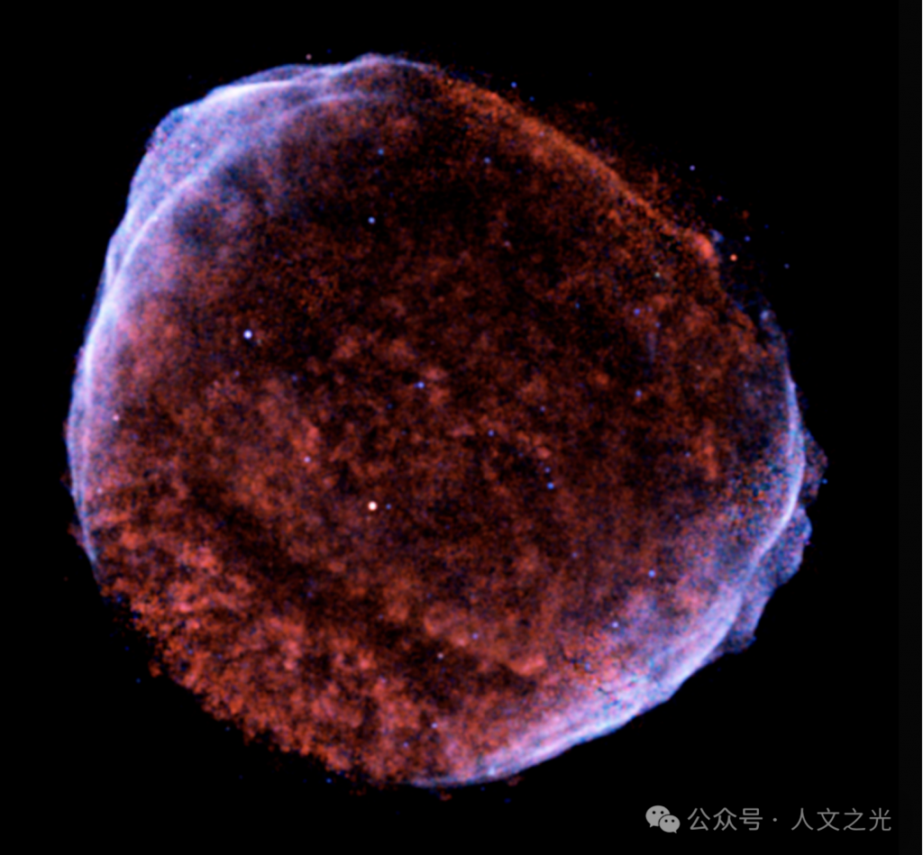 那么这究竟是什么呢?没错,这便是超新星。而我们刚刚提到的则是历史上记录到的最明亮的恒星事件SN 1006超新星。超新星的成因是恒星中的核反应的结束导致恒星从中心开始冷却,它没有足够的热量平衡中心引力,结构上的失衡就使整个星体向中心坍缩,造成外部冷却而红色的层面变热,如果恒星足够大,这些层面就会发生剧烈的爆炸,产生超新星。大质量恒星爆炸时光度可突增到太阳光度的上百亿倍,相当于整个银河系的总光度。