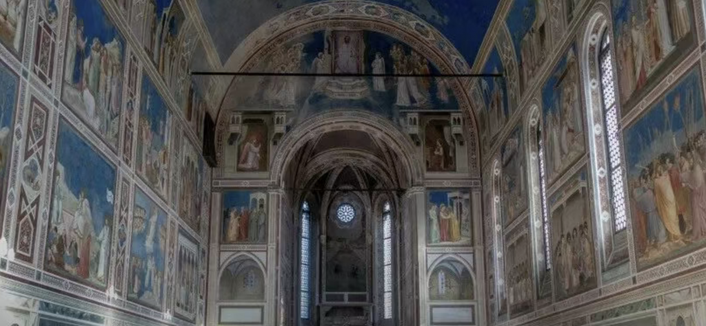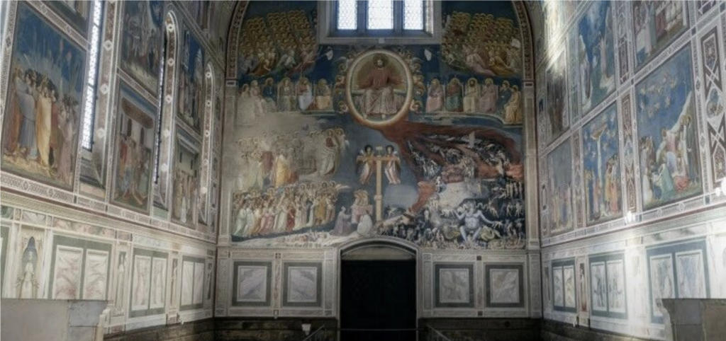 阿雷纳礼拜堂位于意大利帕多瓦,是斯克罗维尼家族的私人礼拜堂。斯克罗维尼家族是一户富有的银行世家,礼拜堂就坐落在他们家族府邸的旁边。恩里科·斯克罗维尼(Enrico Scrovegni)资助了这座建筑的装饰,以赎清他父亲及自己因高利贷所犯下的罪行。在当时,高利贷,也就是对借款收取利息,被视为一种严重的罪恶,会导致灵魂堕入地狱。