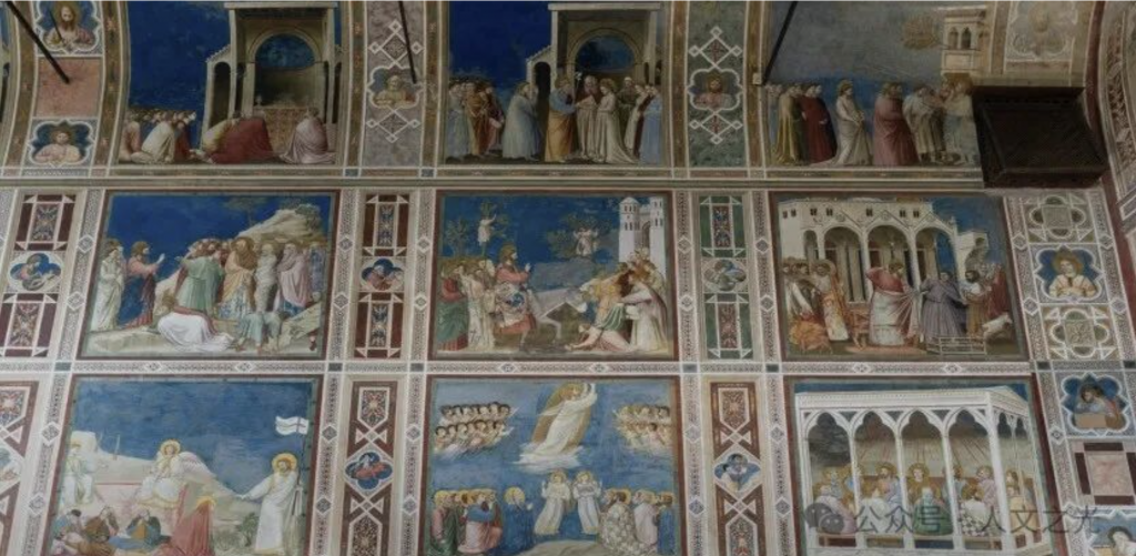 整个礼拜堂内部布满了精美的壁画,这些壁画按照不同层次排列,共分为三层叙事画面: