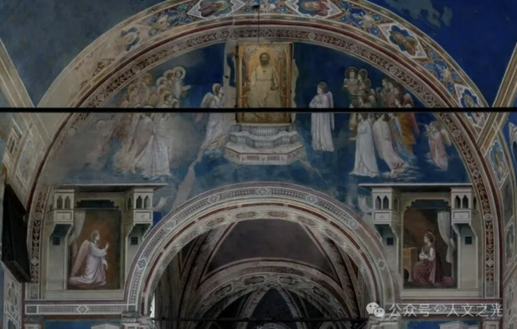 在壁画的左下方和右下方,加百列和玛利亚分别跪在建筑结构内,画家巧妙地运用透视技巧,营造出逼真的空间感。此外,加百列的衣袍褶皱描绘得极为细腻,展现出对现实主义(Realism)的高度尊重。这种表现手法反映了礼拜堂建造时期——即晚期哥特时期(Late Gothic)向文艺复兴过渡的艺术特征。然而,上帝的形象仍采用较为传统的绘画风格。
