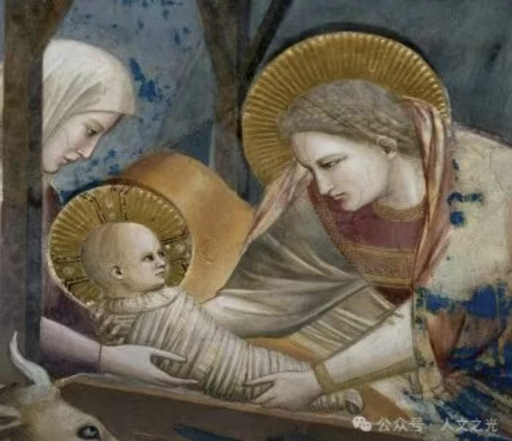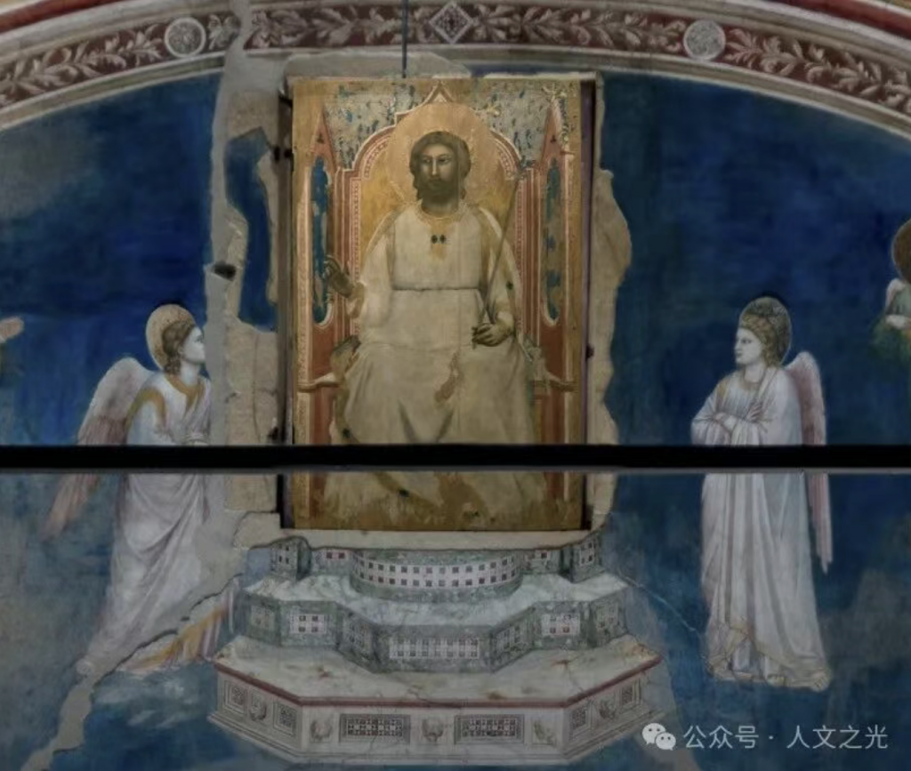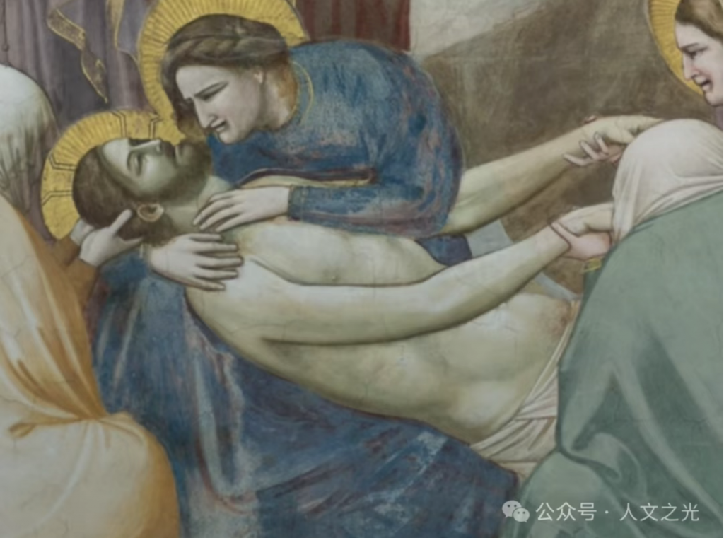 玛利亚弯下身子,充满哀痛地拥抱自己的儿子,这一幕让人联想到壁画上方的另一场景——玛利亚曾抱着幼年的耶稣,而如今,她怀抱的却是自己已逝的成年儿子。