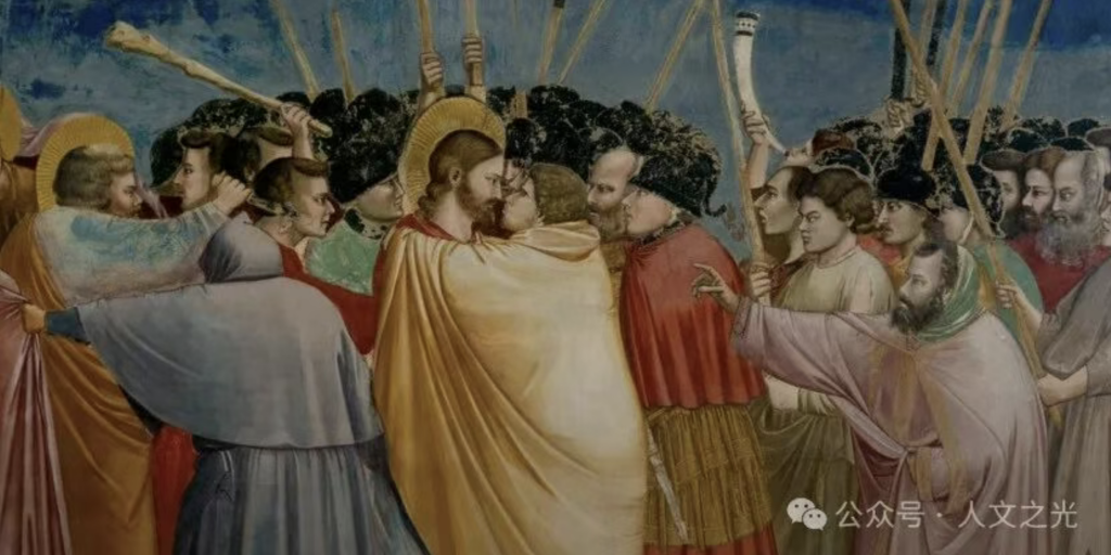 《新约圣经》中明确记载了犹大以亲吻作为标志,出卖了耶稣。马太福音 26:48-49 说道:“那出卖耶稣的人给他们定了个暗号,说:‘我亲吻谁,谁就是祂。’犹大随即走向耶稣,说:‘老师,您好!’并亲吻了祂。” 这一细节为画家提供了一个明确的视觉主题,使得“亲吻”成为背叛的象征性动作。