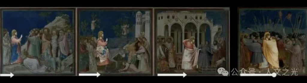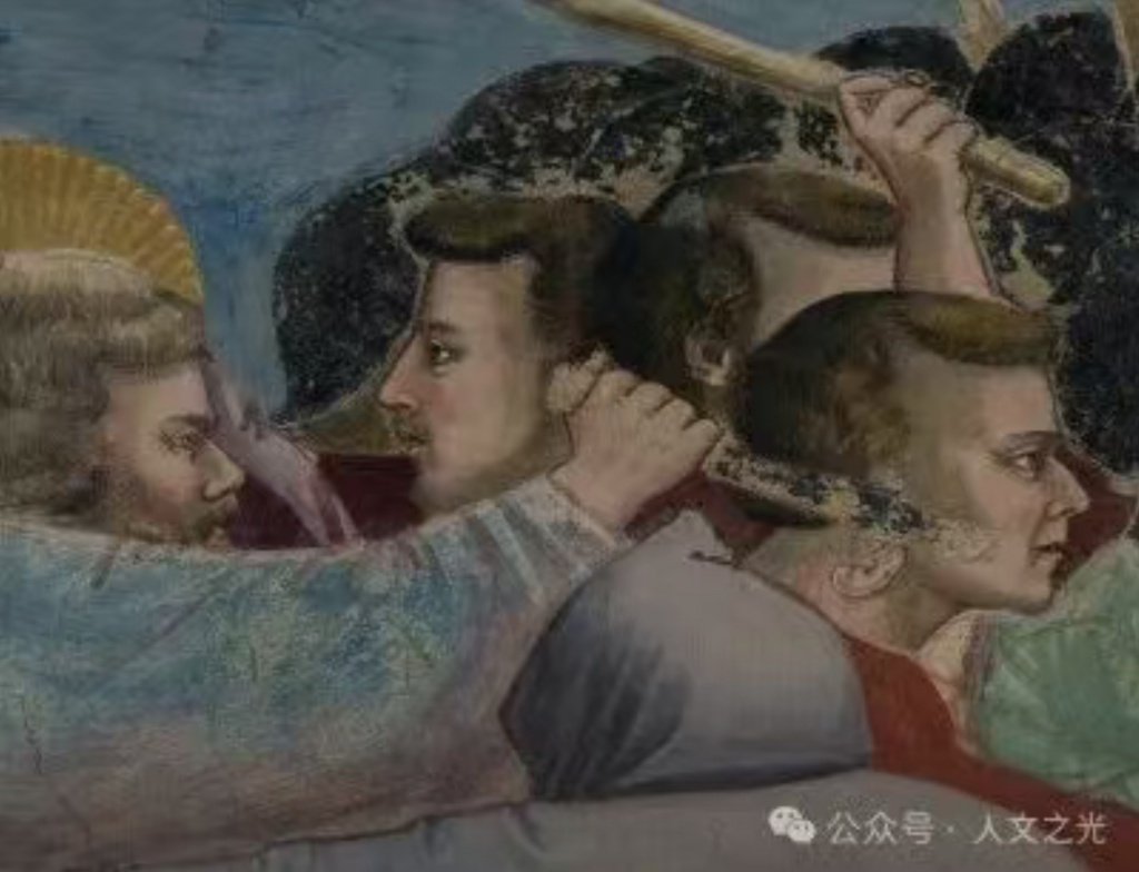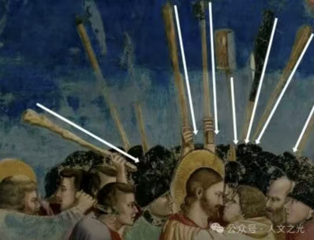在先前的壁画中,耶稣总是以侧面形象出现,并一直向前行进,推动故事发展。然而,在这一场景中,犹大紧紧搂住耶稣,使祂停下脚步,象征着背叛导致耶稣走向死亡的命运。