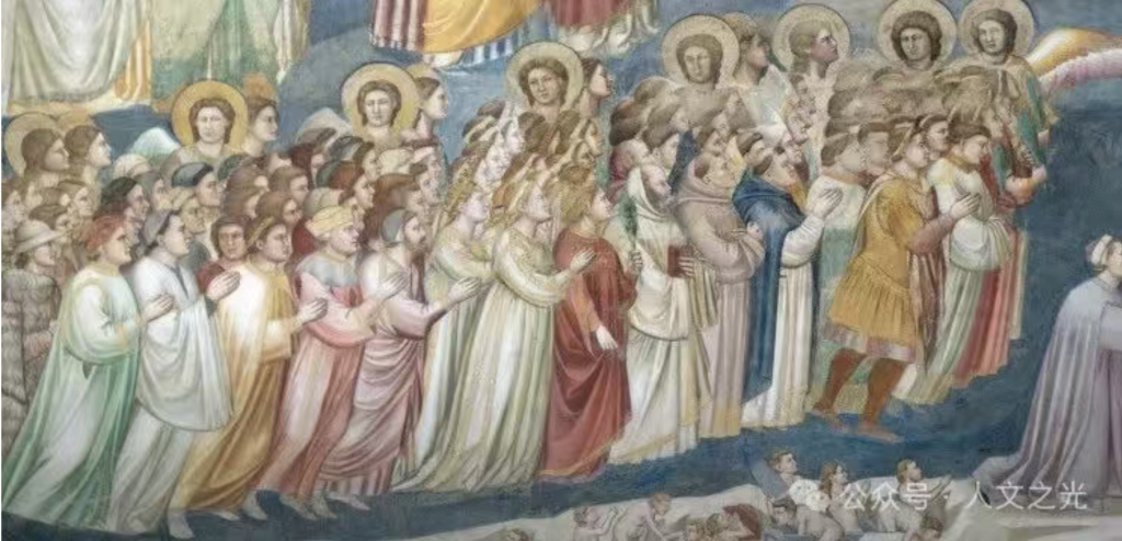 这一部分描绘了被祝福者,他们仰望中央的基督,脚步离地,象征着他们正升入天堂。天使温柔地引导他们走向最终的归宿。礼拜堂的赞助人恩里科·斯克罗维尼(Enrico Scrovegni)虔诚地跪拜在“三位玛利亚”面前,将这座礼拜堂献给她们。