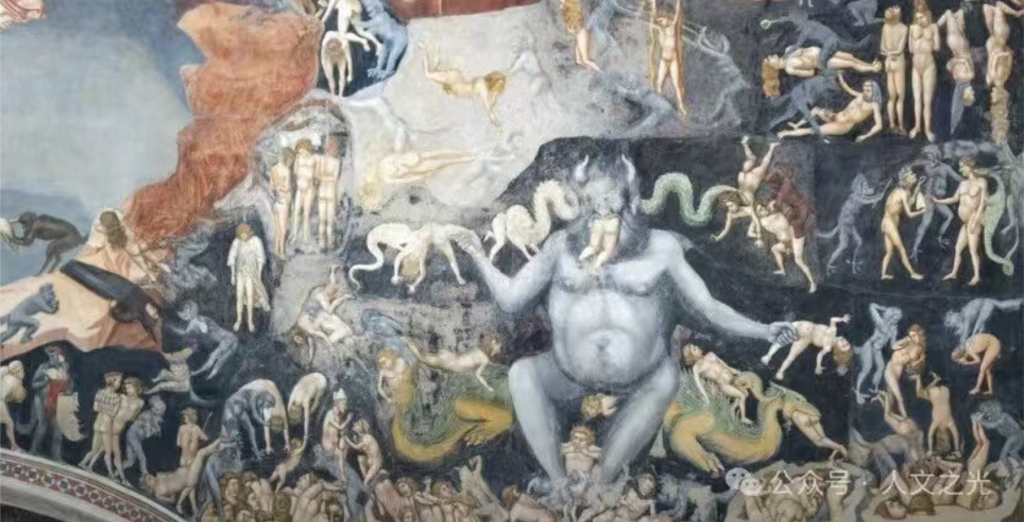 这一侧代表地狱,画面被一个庞大的蓝色身影——撒旦,魔鬼——所主导。无数灵魂正在遭受折磨。其中,放高利贷者的惩罚尤为显眼:他们被钱袋吊起。此外,背叛基督的犹大也被刻画在这一场景中。