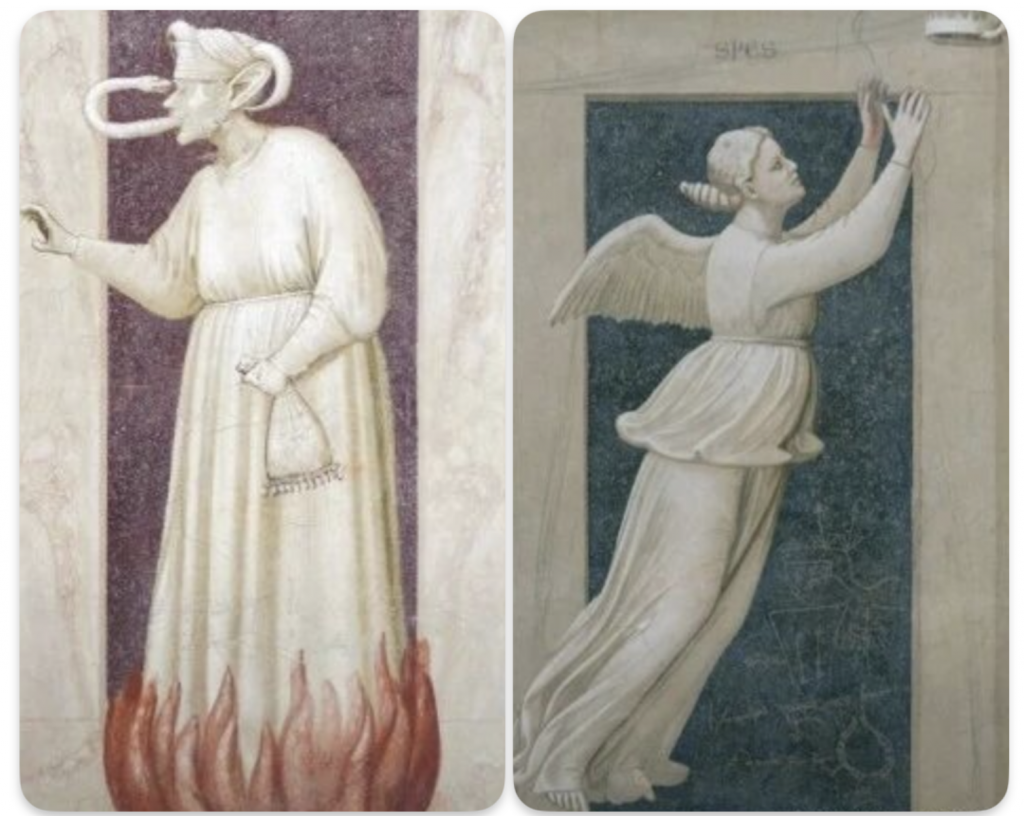 在整座礼拜堂的底部,即所谓的第四层区域,一些小型人物象征着美德与恶行。